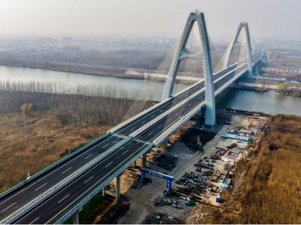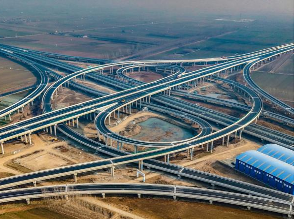 (3)攻坚克难,保障安全: 项目穿越溶岩区、滞洪区等,桥梁占比40%以上,设计难度较大。面对沿线地质复杂、生态敏感及与既有路网高效衔接等一系列技术挑战,项目团队成功将多项创新设计转化为工程实践,确保了项目的顺利落地。在关键枢纽节点,如与京台高速、济微高速的互通立交,团队创新采用集约化、模块化设计方案,在有限空间内实现了交通流的高效转换,最大限度节约了土地资源,并全力保障了施工期间既有高速公路的运营安全。