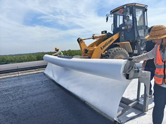 (1)四新技术,赋能品质工程:针对沥青路面易出现横纵缝,且高速公路养护社会影响较大的痛点,部分路段采用聚丙烯长丝防裂基布技术,该材料可替代传统预拌碎石封层,通过“防水层+防裂应力吸收层”的复合防护体系,构建起多维防护网络,阻断水分向下渗透,并通过应力重分布阻断裂缝向上扩展,实现路面结构的性能整体提升及全寿命周期理念。